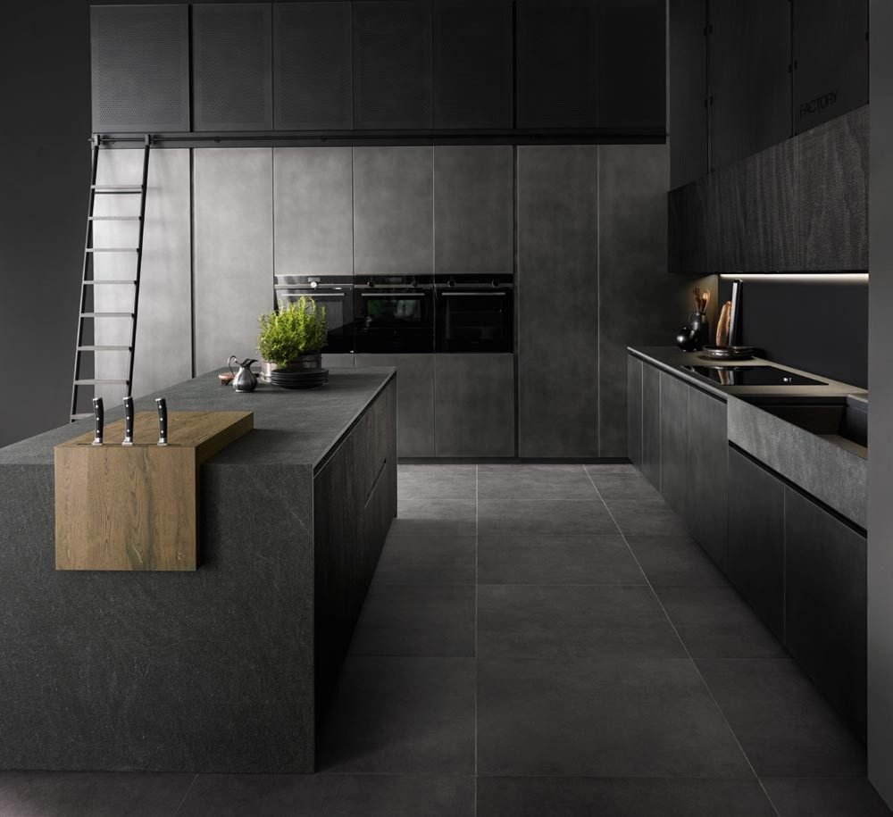 If you like the look of dark modular kitchen interiors, take inspiration from this one where the materials used on the cabinetry, countertops and flooring are extremely well-matched. Adding to the seamless flow from one surface to the other is the waterfall edge kitchen island that adds to the dark sophistication of the space. The matte finish surfaces also have a hint of visual texture to each. We love how the elegant wood chopping board with a knife stand adds a hint of warmth as well as a ton of functionality to the space.