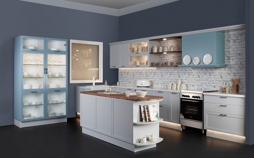 With the chimney hood and china cabinet in baby blue and the walls in a deeper azure the rest of the modular kitchen’s muted design serves as a blank canvas to enhance it.
