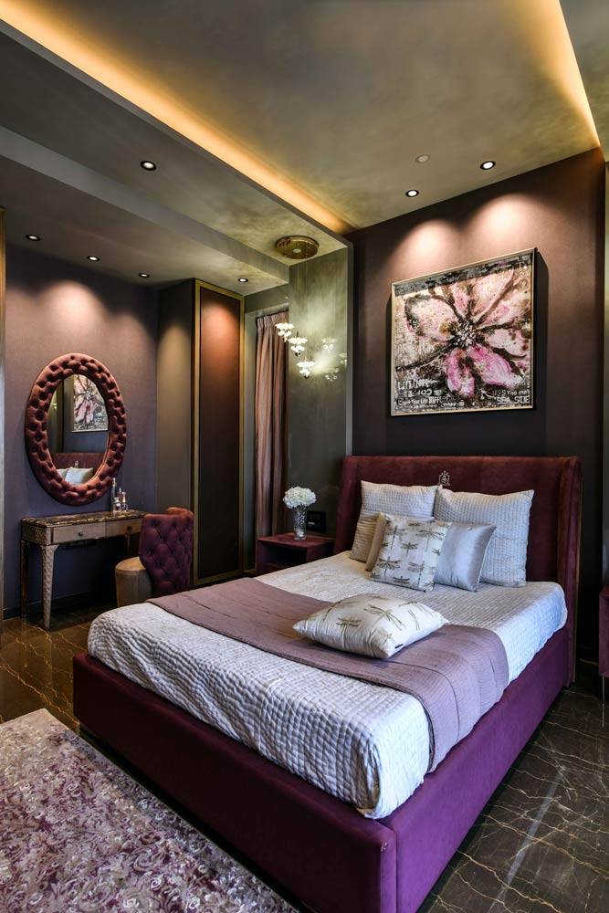 We all know that purple is a colour most commonly associated with royalty and luxury. If you’ve ever wondered why, this room is proof enough! The purple two-colour combination for bedroom walls, with a bit of white lining has grandeur beautifully written all over it. And it’s not just purple, it’s different shades of purple, that make it look so lovely. The touch of soothing lilac in the linen, the purple frame of the mirror, and the warm ceiling lights only complement the grandeur of this bedroom. This one is probably a bedroom design that beats that of your favourite hotel!