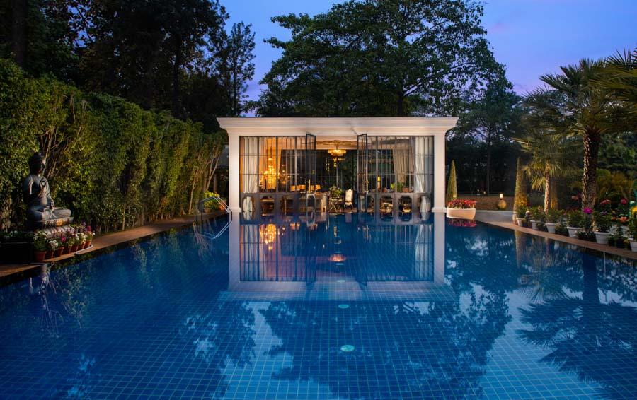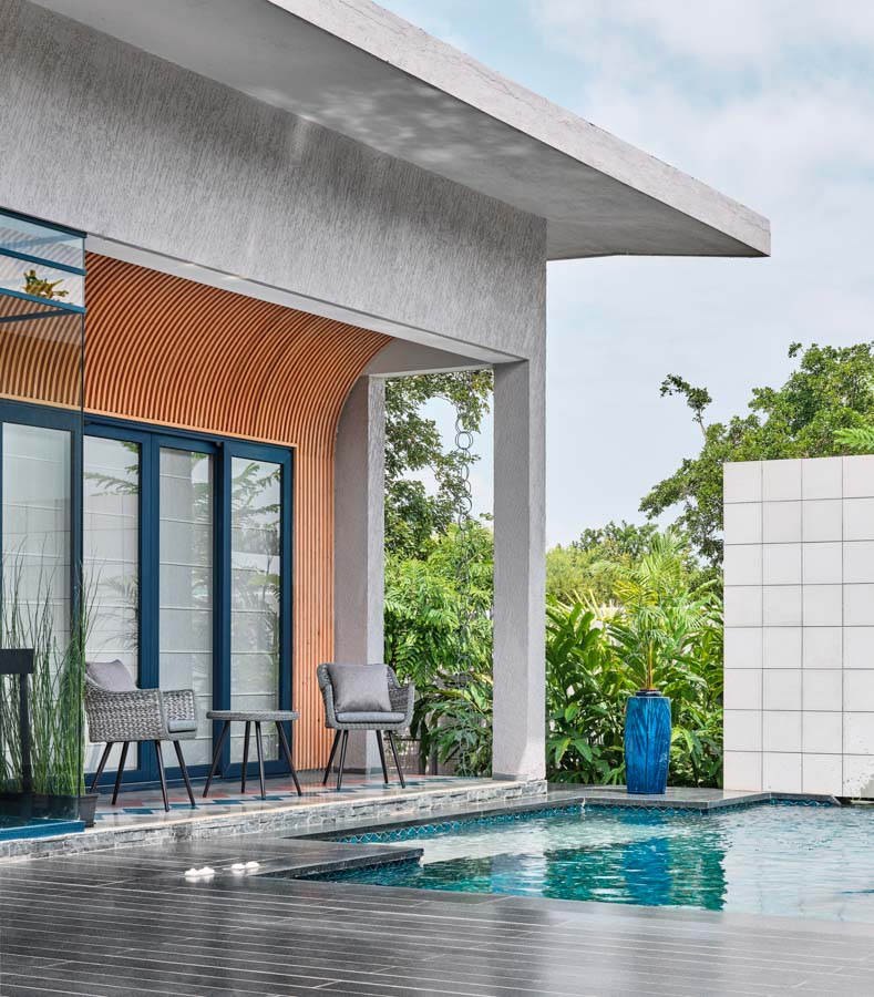 Style Tip: A uniform-tiled pool in a deep shade of blue will make the water look even more striking, especially after sunset. To enhance its vivid hue, strategically place lights around the pool or within plants to bring out the colours in the dark. Marking out the walk to the pool with palm trees will also add to that playful holiday vibe!