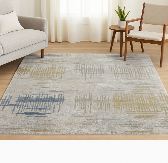 The IMPRINT rug is a rendition of woven fabric depicted with the serene tones of ashwood and skyline blue. Hand-tufted with a harmonious blend of wool and viscose, its texture and style exudes a sense of creative depth and endless exploration.