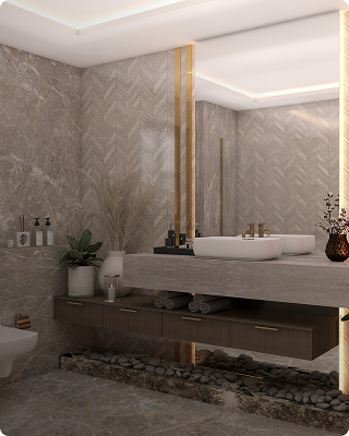 This modern bathroom design features sleek brown porcelain tiles, offering a sophisticated and warm ambiance. The rich color adds depth, while the durable material ensures longevity. Paired with minimalist fixtures and light accents, the space achieves a balanced, contemporary look that is both stylish and functional.