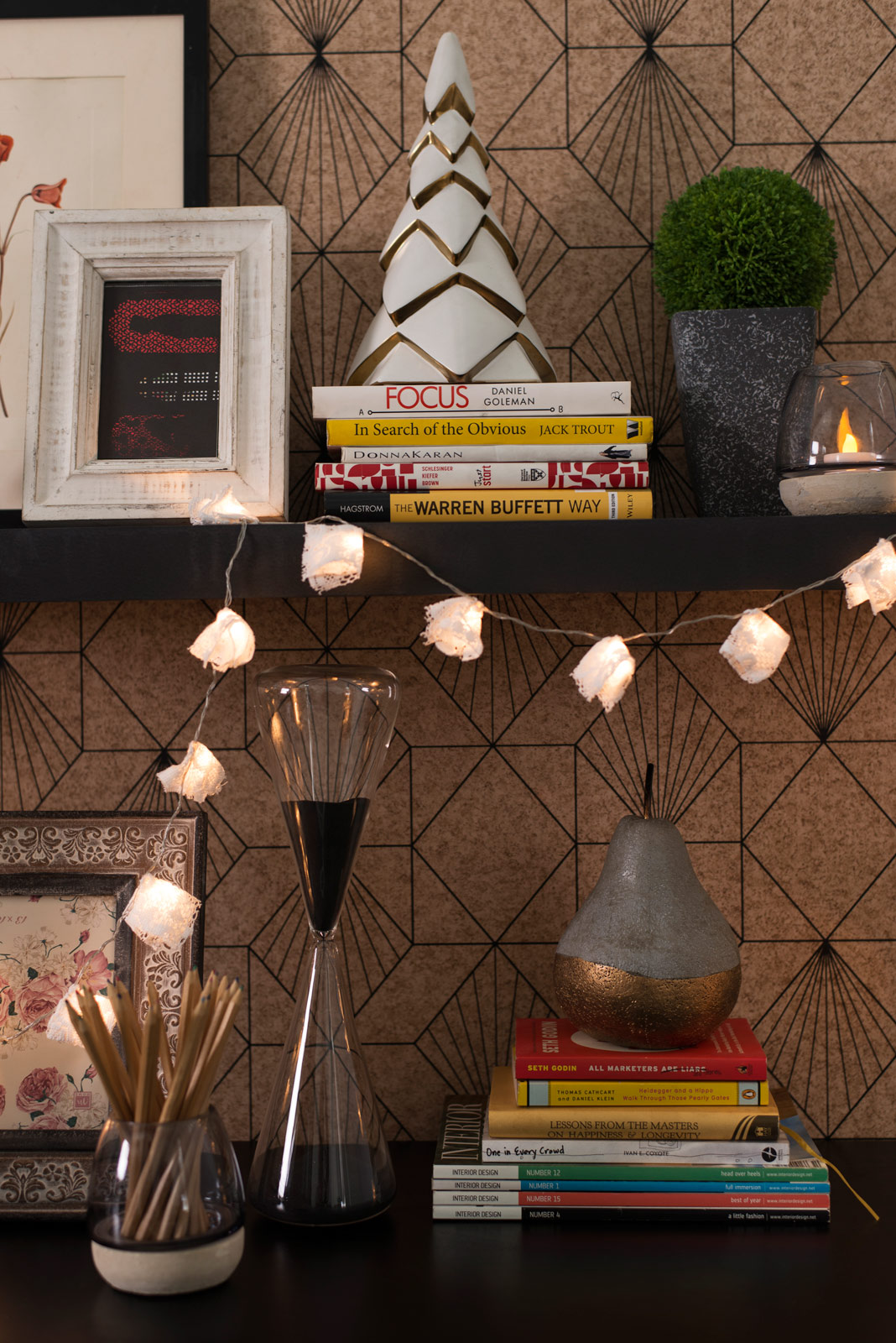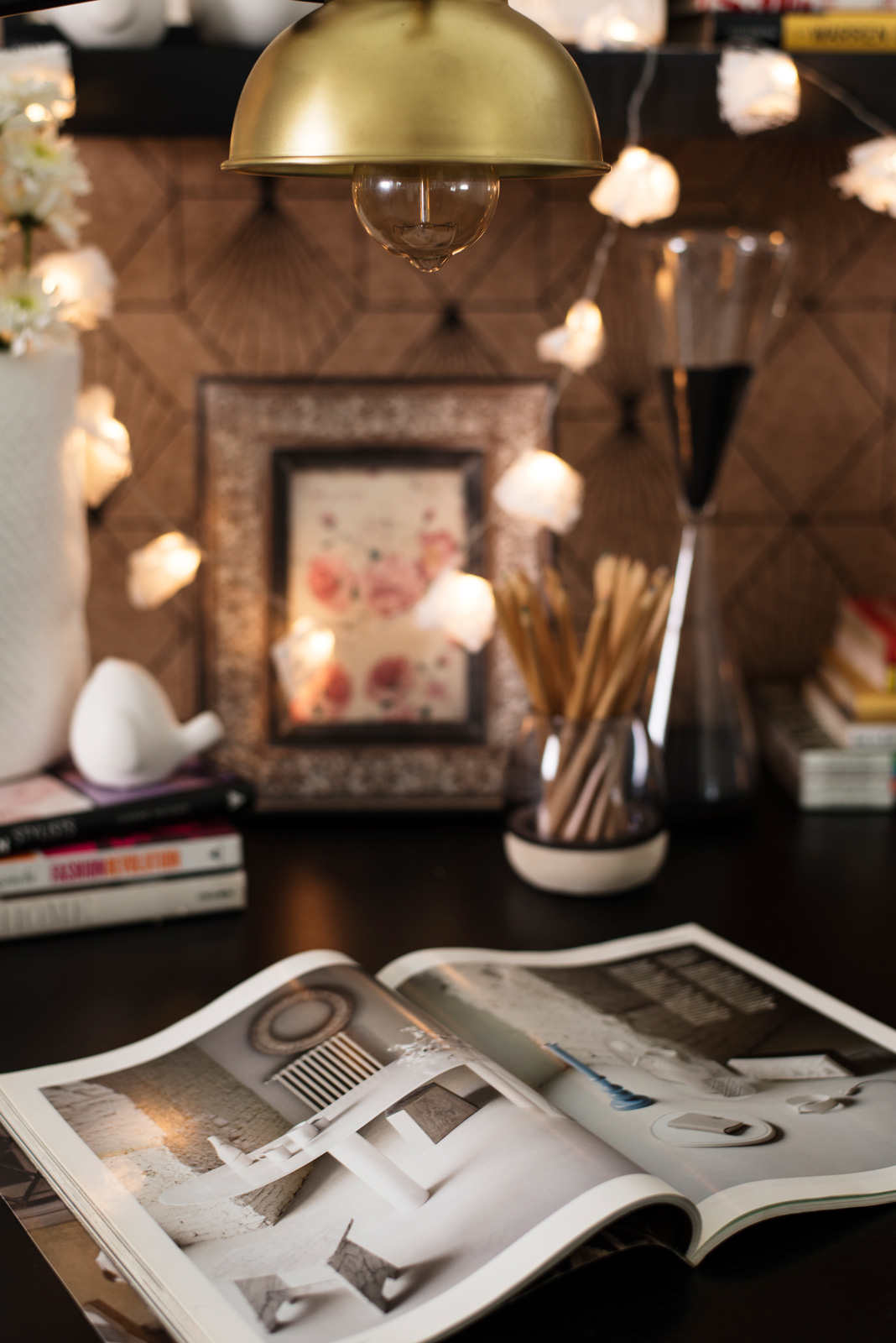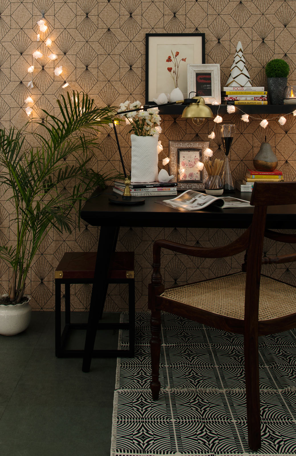 Your study doesn’t have to be a formal and cold space you can add study table in your bedroom, devoid of any colour and art. In fact, having a few of your favourite things around can help you work better. Skip the solid colour wall for a patterned wallpaper. Steer clear of very busy prints as it could be distracting. Next, place your table and chair against the wall, preferably near a window. If you’re short on storage, a floating shelf can come in handy to arrange your favourite artwork, some potted plants and reference books. Motivational posters and votives can also go here. Now you will have some clarity on what needs to go on your desk. For this look, remember to toe the fine line between downright messy and organised chaos, so start with the essentials. A sleek, brass desk lamp, stationery holder and important reference material go first, then come the photographs and travel finds. Lastly, add some cheer with fairy lights and fresh flowers.