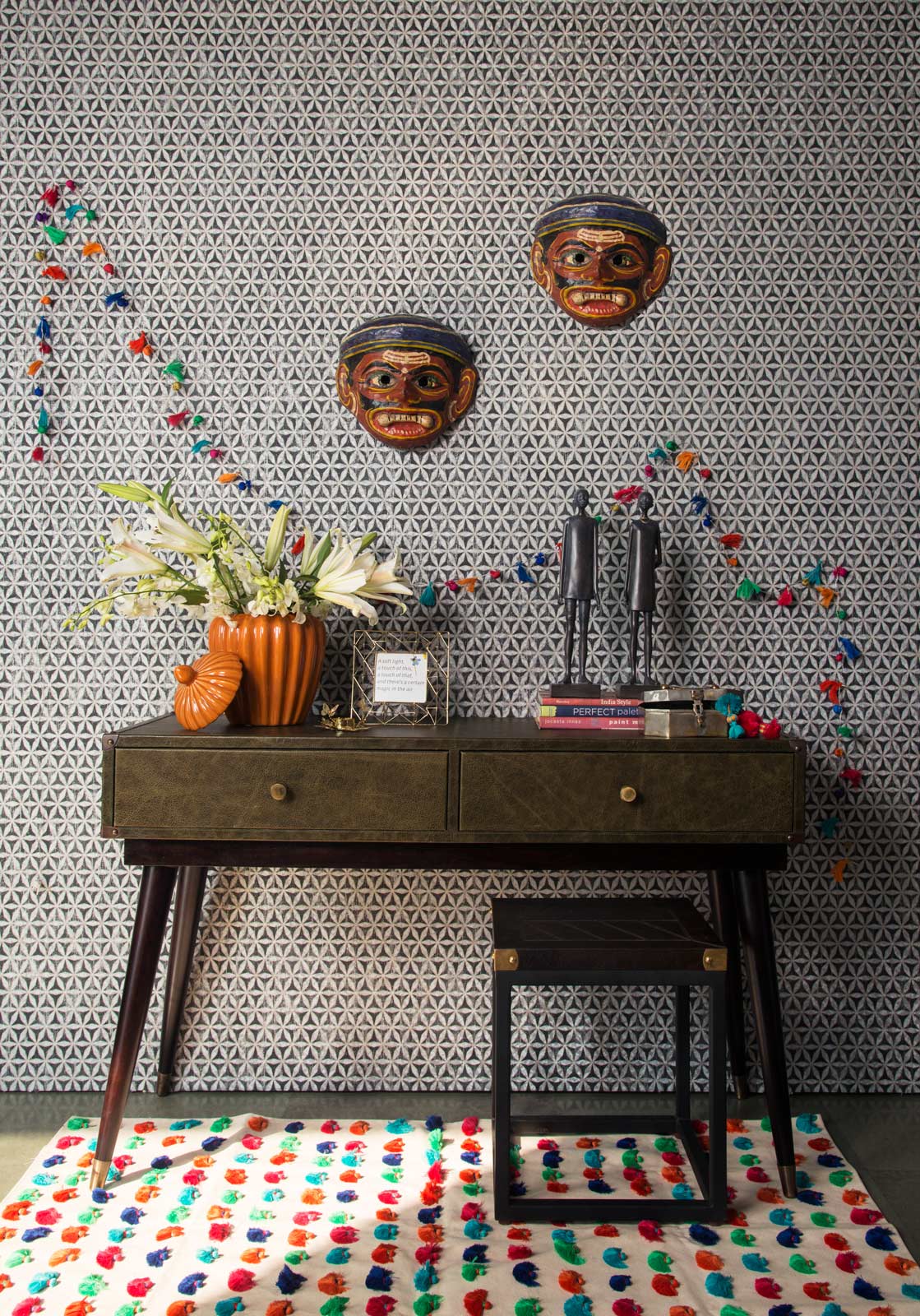 Give your entryway an ethnic yet stylish makeover with traditional masks and folk-inspired accents