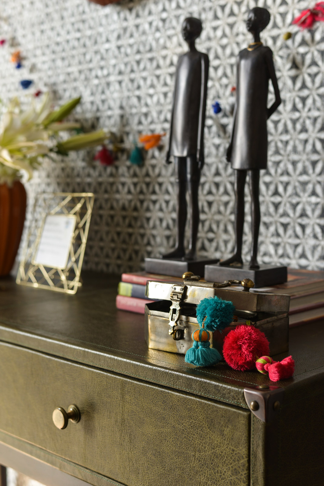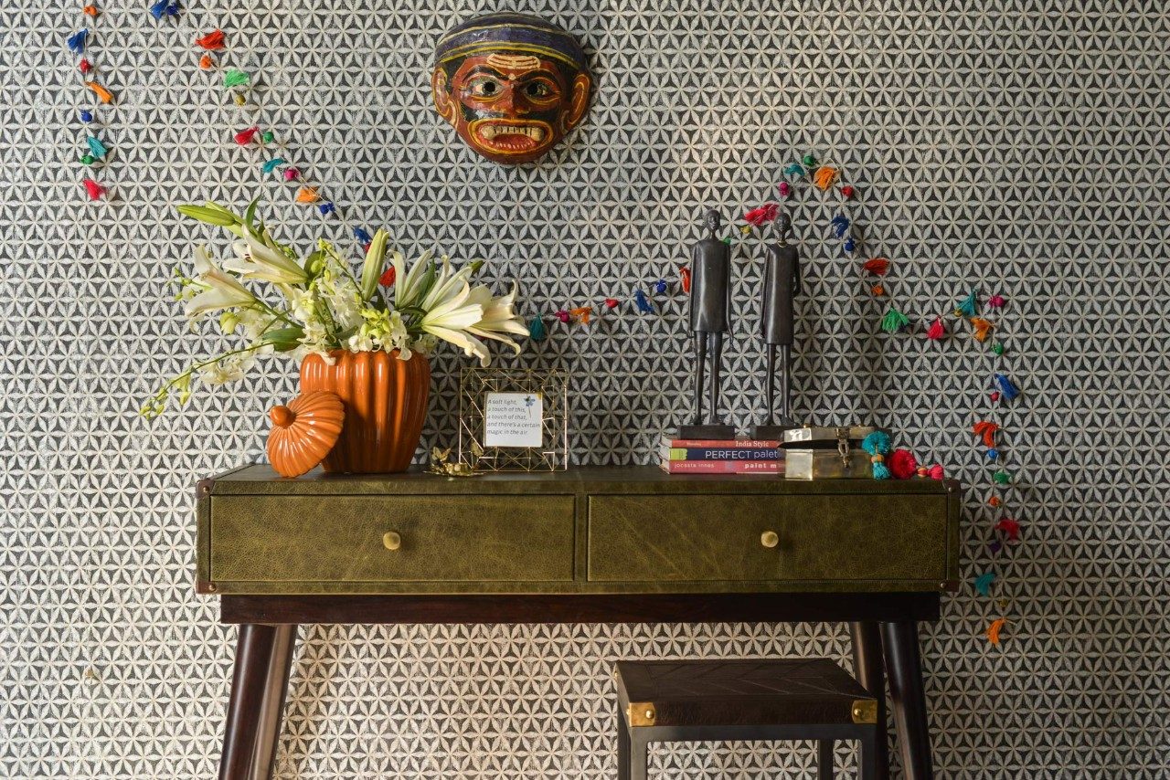 Don't have the luxury of an entryway leading to your living room? City living with its cubbyhole apartments often translates into tight living spaces. But that doesn't mean you have to lead your guests directly into your living room. Create a dummy hallway by treating one side of the wall to your door as an accent wall. Try and demarcate the spaces visually – use a bold wallpaper, preferably a monochrome to define the space. Place a sleek console against it or if you have an old study desk or small table you’ve out grown, that will work too. Just keep in mind that it doesn’t block a large section of the entry. Remember, you need make this area into a warm and inviting space. Something that reveals a little about you. Your entryway is like an Amuse Bouche. It needs to give a glimpse of what to expect. So do away with the cookie-cutter, hotel-style, all beige and mirror approach. Instead pull out those masks you bought at that fair you last went to, put out a few of your favourite books, and flowers. Fresh fragrant flowers not only lift the space but also work as natural scent diffuser. You can even weave a colourful bunting with pom poms for a dash of fun. Now, did we hear a bell ring?