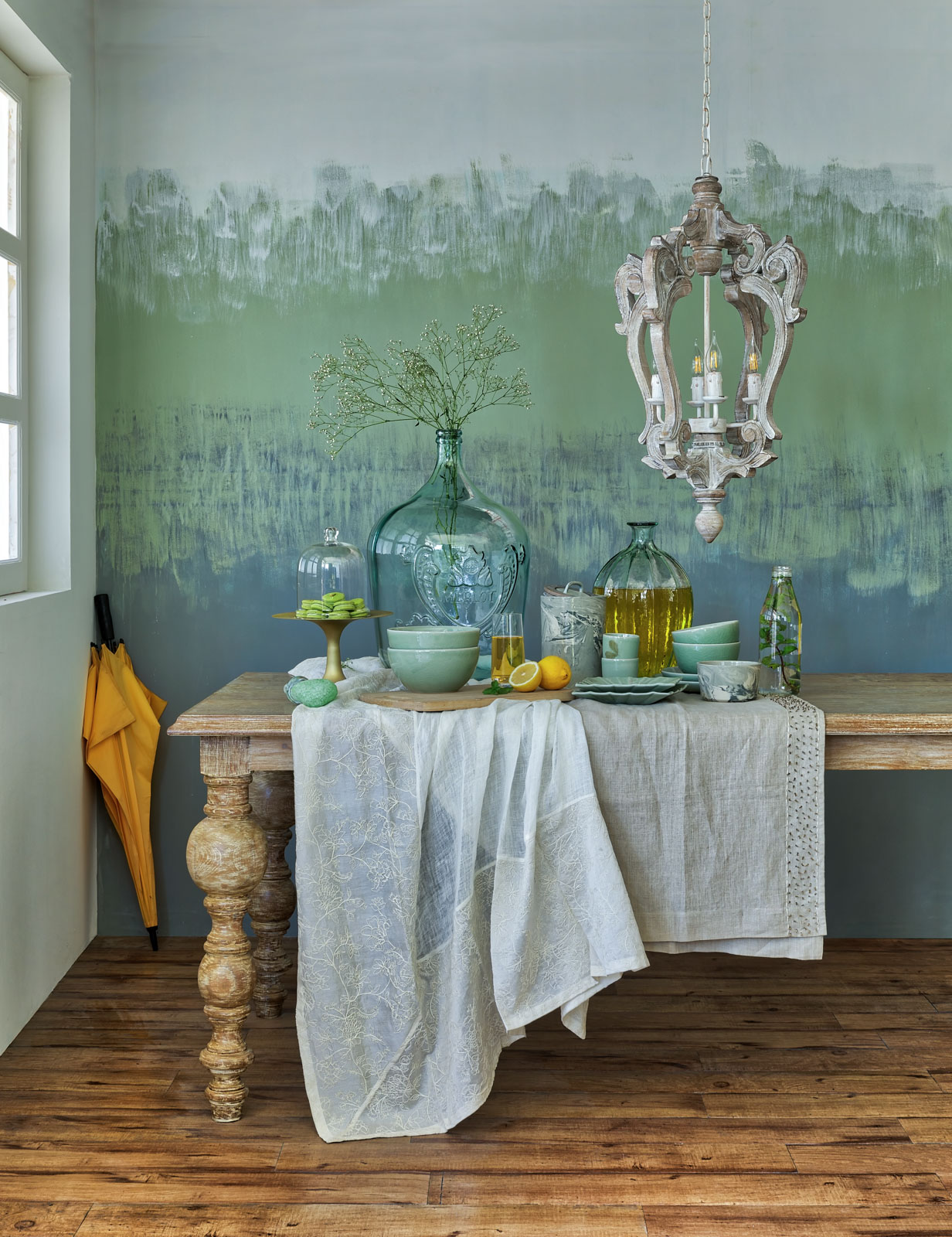 It’s a no-brainer - green is emotionally soothing, easy on the eyes and the perfect colour inspiration for the upcoming monsoon. A pale green palette has some serious old school charm about it, and in this setting the distressed furniture and chandelier paired with translucent and solid green tableware adds more character to the look.