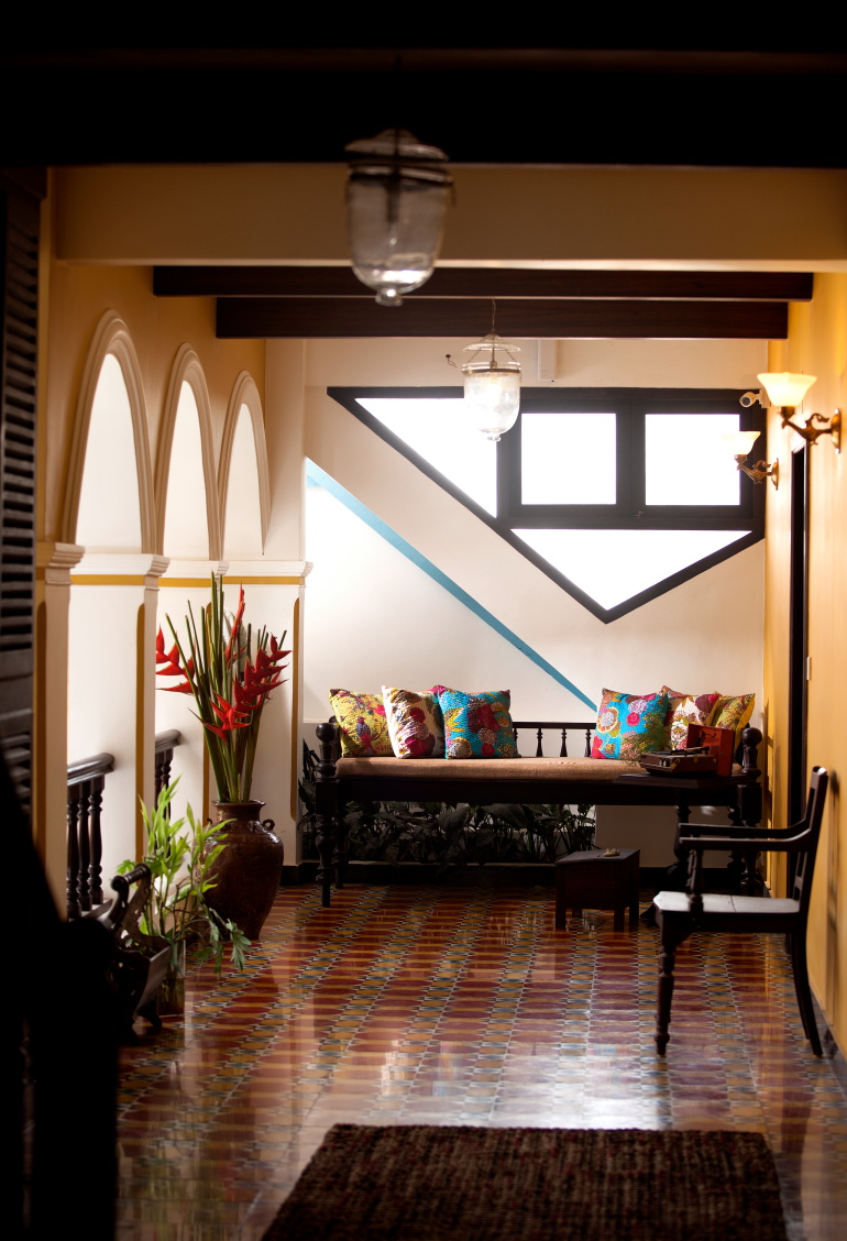 In fact, colour is used unabashedly throughout – from the bright summery yellow on the façade to the pretty Athankudi handmade tiles used as flooring. The flooring plays a key role in dividing areas and demarcating spaces within rooms and public spaces of the hotel. This is something we can adopt in our homes as well. If you have a vast living room, use dual flooring options to break the space down for various uses. The same can be applied in the bedroom too – where the area with the bed has a stone floor while the study has a wood floor.