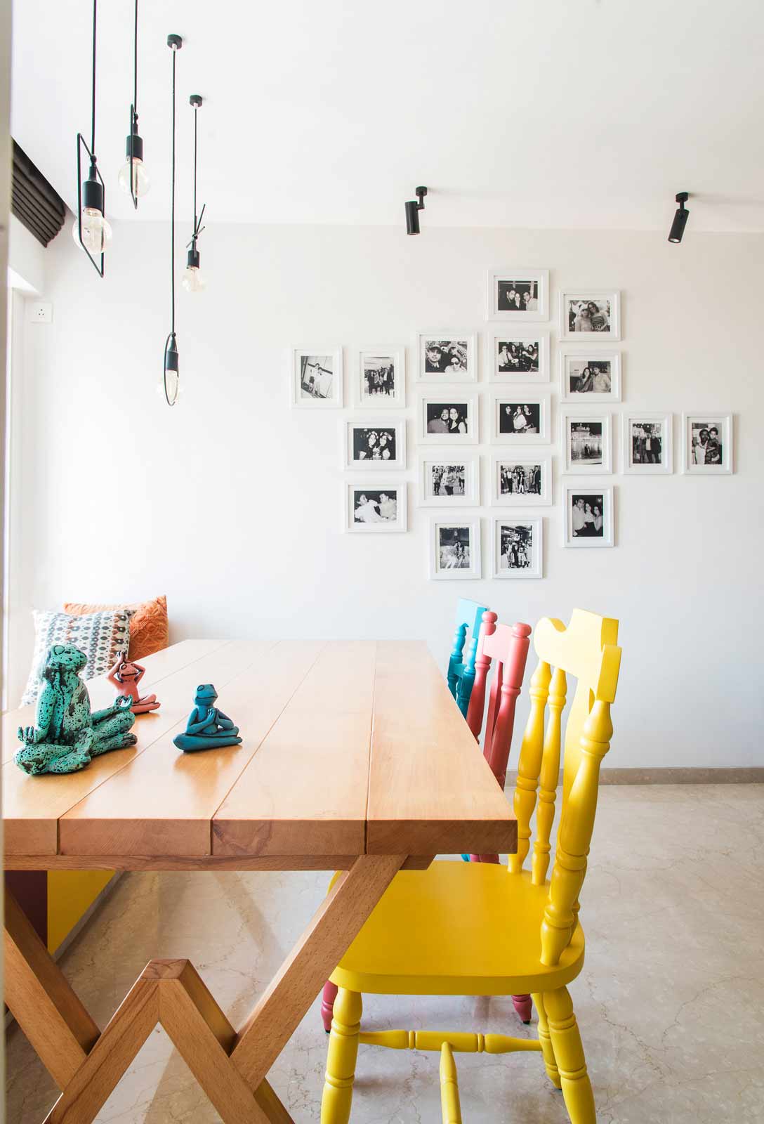 Bright table runners, coasters with peppy prints and small, tinted glass vases with fresh flowers, not to mention crockery and cutlery too, can play a role in making your dining room design more colourful.