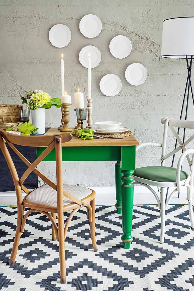 Why limit colour only to the living and bedrooms? There’s plenty of scope to play with in the dining room as well, and there’s more than one way of doing it too! Even if you don’t want to repaint the entire space, just retouching the dining table and chairs can make the space seem as good as new.